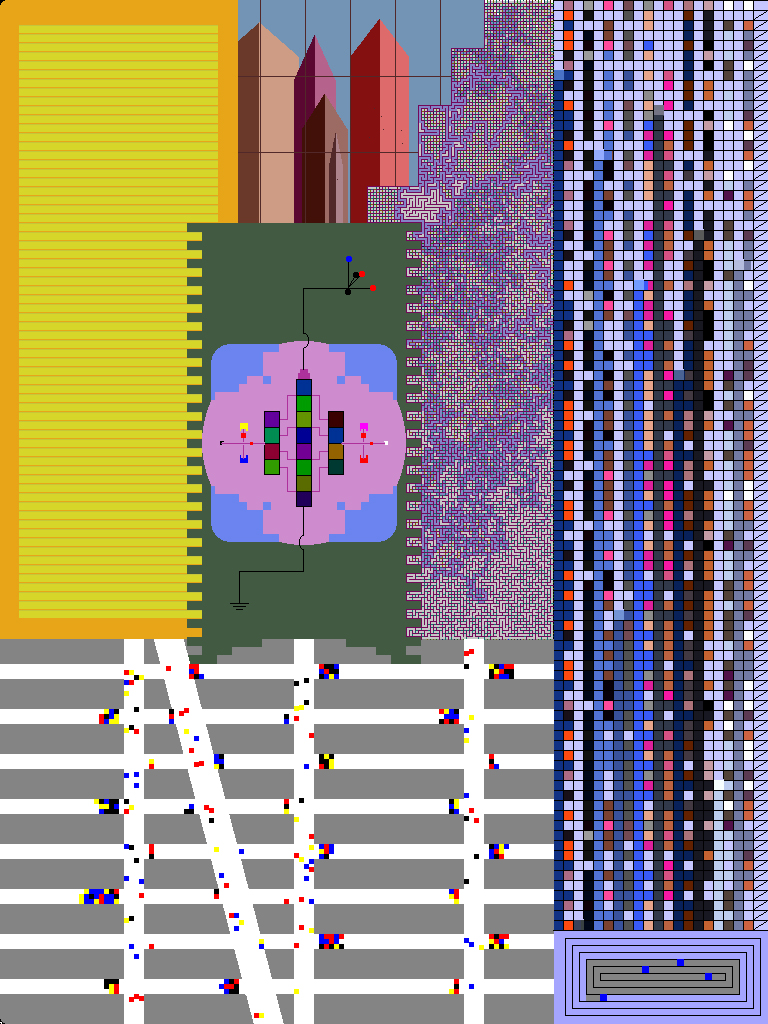 ComplexCity is concerned with the realism of abstraction. A modern day cityscape, including skylines, skyscrapers, and a traffic flow reminiscent of Mondrians Broadway Boogie Woogie, Complex City explores the pure abstraction of Mondrian and the abstract realism of Stuart Davis. One of my more autobiographical works, ComplexCity documents my relationship to New York City.