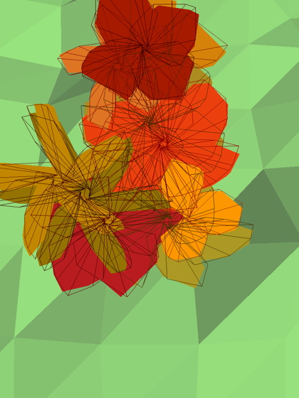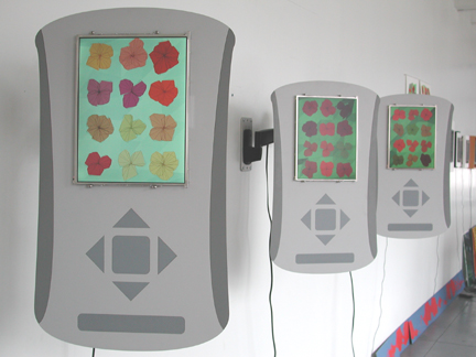 PDA, Personal Digital Art or Pop Digital Art, pays homage to the Pop Art movement and the proliferation of handheld electronic devices. The work loosely resembles an oversized personal digital assistant. The screen displays changing compositions of flowers over a continually moving background. The wave-like motion of the background resembles pulses of communication, a reference to technologys ubiquity. The work is my first one that explores composing a subject on shifting ground.