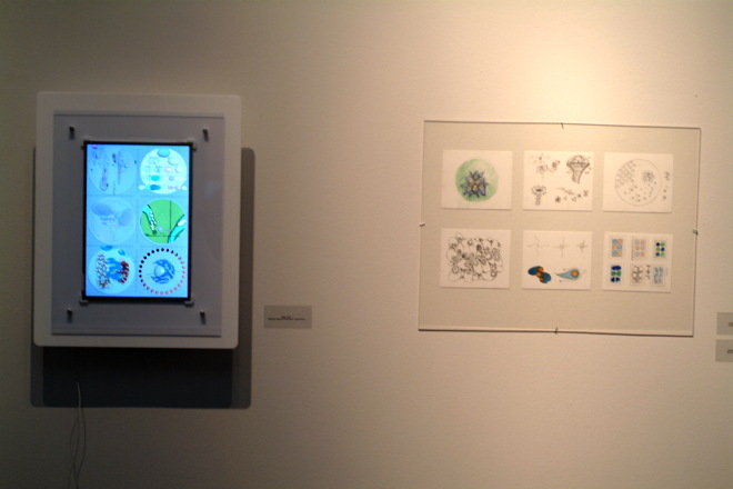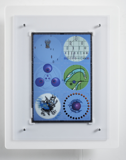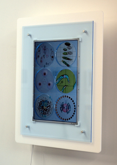 aLife is a glimpse into the evolution of six tiny worlds. The worlds are created by the artist in software and are defined through the language of scientific instrumentation with references to microscopic, telescopic and satellite imagery. The software relies on real-time simulation to create compositions that constantly change and don't repeat for billions of years. There is a high degree of integration between the image on the screen and the frame surrounding the screen creating a unique instrument for visualization.