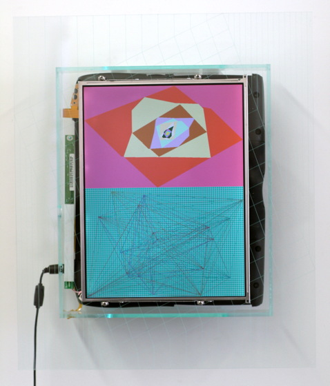 Inspired in part by the logo for Hitchcock's Vertigo, Window is the first software wall object where I extend the composition from the screen to its acrylic frame. Lines etched in a green edged glass-like acrylic refer back to the simple rules of the software: The top image starts with a solid color rectangle. The program then picks 4 new points, one for each side of the rectangle. The rectangle is then rotated until its corners are at the 4 new points. When the rectangle moves, it reveals a new color. Earlier artists, such as Sol LeWitt, created rule based works for manual implementation. In Window, the computer implements my instructions and is able to iterate through endless combinations, re-executing the rules continuously.
