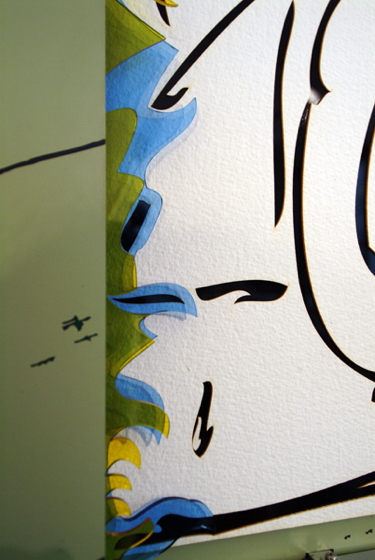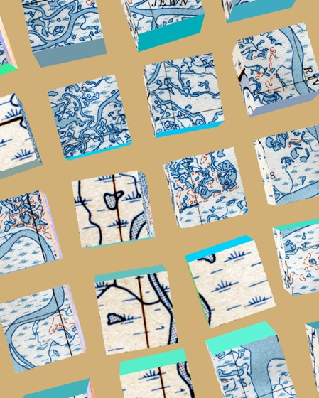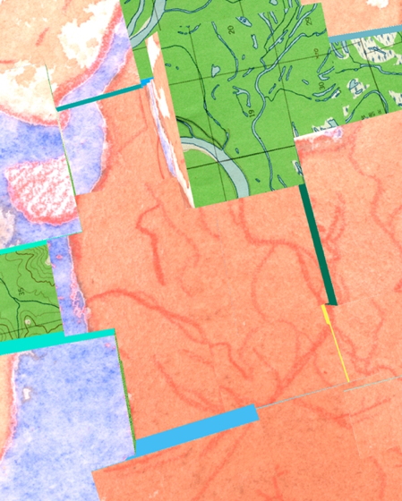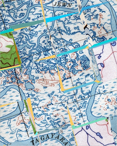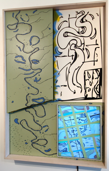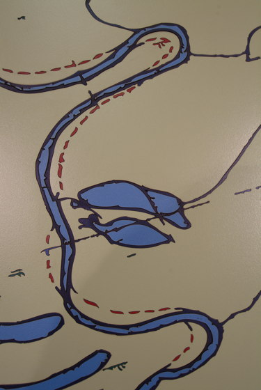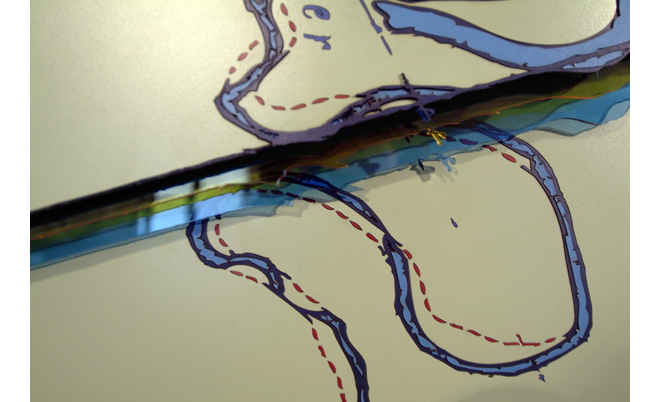 River was originally realized as The Map Is Not The Territory for the windows of Macy's Herald Square on 34th Street in New York City as part of the 'Art Under Glass' exhibit in 2006. After the exhibition it was reworked and renamed River. River combines an inlay map, a paper sketch, and many map images changing in real time on a screen.