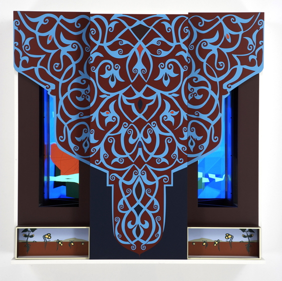 An imposing solid figure on the wall, Tree appears rooted in John Simon's ideas about art and information. The twirling vibrant interlocked Formica branches on the surface of the piece are a study in color contrast while something seems to be moving inside. The prominent wings of Tree shade two windows through which we seen an endlessly unfolding array of symmetrical branches from which occasionally a flower blooms.