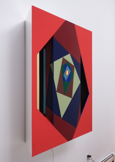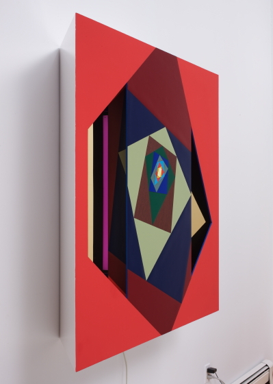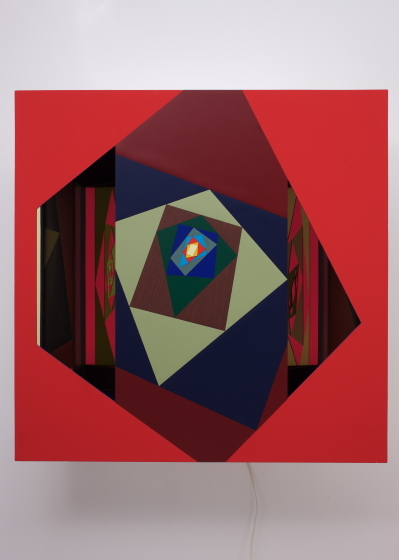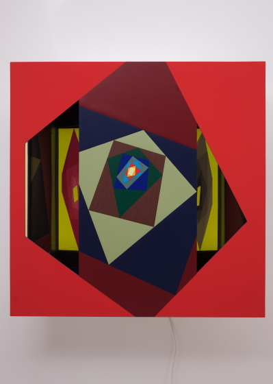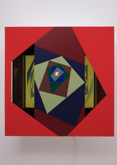 A complexly angled and mirrored artwork, Visions is an illusion on the wall that defies its apparent depth. A motif of 'shapes within shapes' is echoed on the face of the work and in the unique software; which computes endless variations of the central design in motion and color.