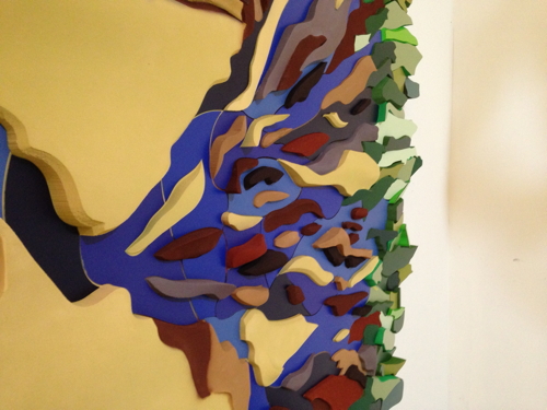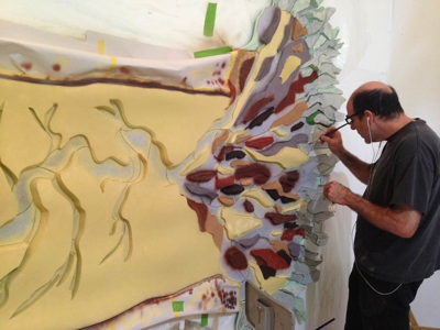 Here I am working in my studio on Moment of Release, a new artwork that will be included in my exhibition at The Phillips Collection opening this October. Moment of Release is an enlargement of my daily drawing from 12.4.2012. At that time I was working through variations of a symbol I call an 'expansion'; an image that initiates inside a frame and then grows to exceed the bounds of that frame. The symbol felt like a good metaphor for both unchecked industrial expansion and the unlimited potential of my own thoughts. Its installation at The Phillips Collection will be the premiere for Moment of Release and for all the new 3D style work I'll be showing this fall in NYC. [detail shot] |