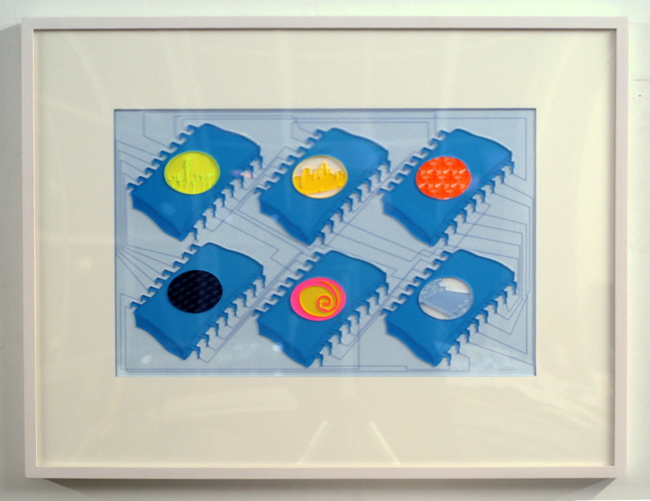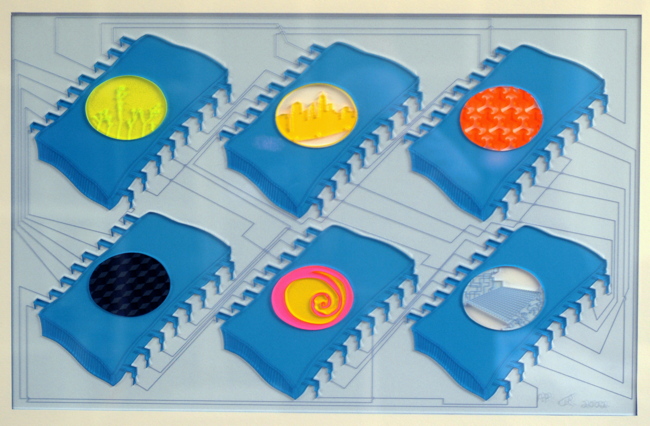 Closed Circuit embodies the closed loop of an algorithmic world view. The imagery is a matrix of six interconnected stylized computer chips. The center of each chip exposes a particular computer application; from making patterns to modeling nature. Some centers were created by hand gestures and some were software generated. Digital systems also controlled the laser that cut the Plexiglas material - the computer creating its own image.