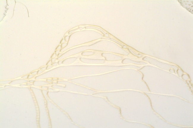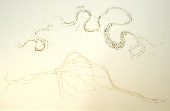 Two Rivers combines John F. Simon, Jr.'s fascination with river forms and his experiments in laser fabrication. The two rivers depict contrasting types of flow. The upper river is a 'meandering' form that is characteristic of a mature and even flow. The lower river is a 'braided' form that results from flooding. Simon chose to cut and physically lift portions of the meandering stream above the surface of the piece. The channels of the braided stream are, by contrast, deeply engraved. The piece is made of sanded white acrylic plastic. Simon used a solid color to emphasize the surface texture. He choose this piece as an experiment in the visual/tactile because manipulating physical texture is not a possibility in his well known software artworks. Nevertheless, software processing of geologic maps and computer control of the laser were at the heart of this production.