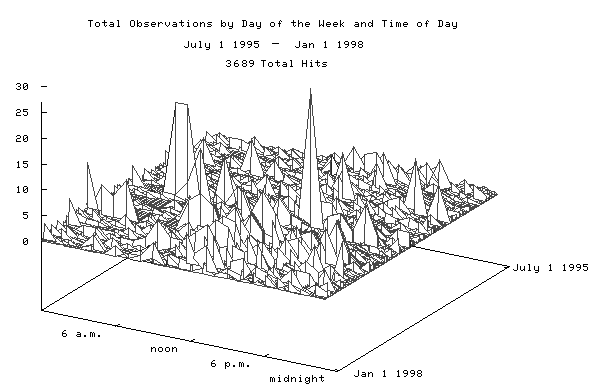 The second page showed users two graphs that displayed the effect they had on the project. The top graph showed all the hits during the current day - displayed as hits per hour. The observers remote host name was identified in the graph. The bottom graph integrated the daily statistics into a 3D plot of the hits accumulated in the previous seven days.