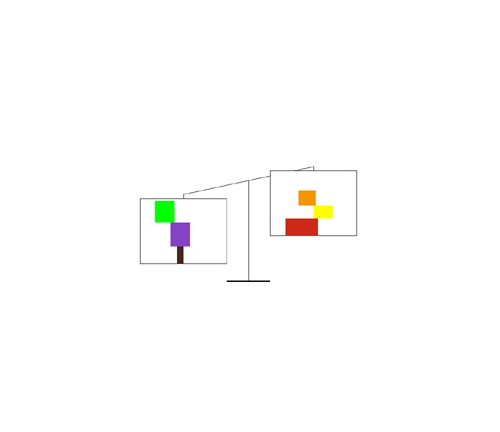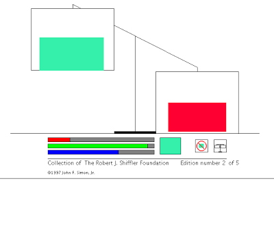 Color Balance behaves like a scale, a horizontal bar with weighing pans at either end. Rather than standard weights, the items placed in the pans are rectangles of color. The balance shifts back and forth as rectangles are added and removed. Although color is perceptual and has no mass, Color Balance is an environment where a color's weight is measurable.