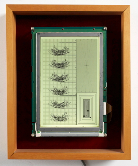 Clock Piece explores three aspects of time. The upper right portion of the screen is a double pendulum that swings back and forth and represents the shortest duration of change. The left hand side of the screen activates a Paul Klee diagram of pendular motion. It uses Klee's sketch as the starting condition and explores the diagrammatic possibilities of pendular motion. By building up a drawing over multiple passes of the pendulum's trace, this section represents time of intermediate duration. The lower right portion is an accumulator, an odometer-like device that saves its state to disk making the display persistent over the duration of the seventy years it takes to fill. |